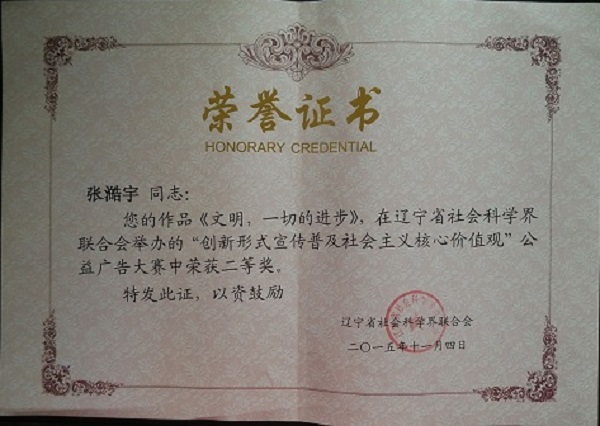 近日,辽宁省社会科学界联合会举办的“创新形式宣传普及社会主义核心价值观”公益广告大赛评选结果揭晓,beat365建筑与艺术系2012级学生张澔宇在唐丽娜老师的指导下完成的3幅参赛作品《文明,一切的进步》荣获二等奖。