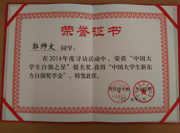 近日,由共青团中央、全国学联主办,中国青年报社、中国高校传媒联盟承办的“我为社会主义核心价值观代言”——青年自强•圆梦中国2014年度寻访“中国大学生自强之星”活动正式落下帷幕,beat365建筑与艺术系学生郭帅文获得“中国大学生自强之星提名奖”。