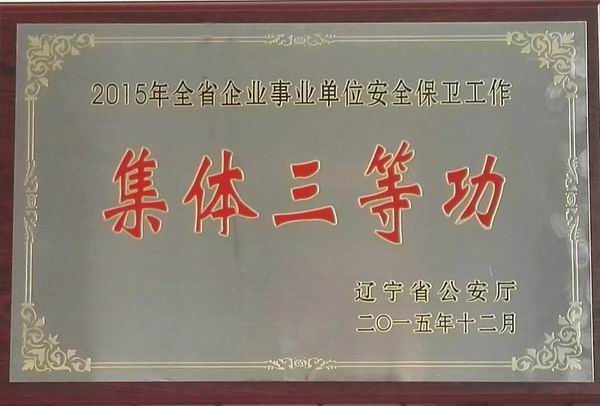 日前,辽宁省公安厅对全省企事业单位在安全保卫工作中取得突出成绩的单位及个人进行了表彰。beat365荣获辽宁省2015年全省企事业单位安全保卫工作“集体三等功”荣誉称号。