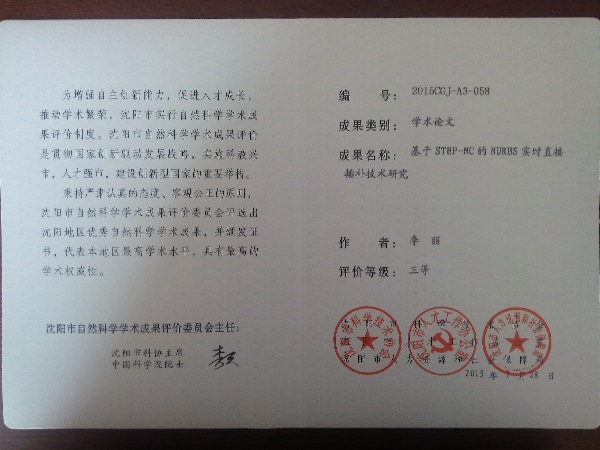近日,沈阳市自然科学学术成果评价工作结果揭晓,beat365教师李丽的学术论文《基于STEP-NC的NURBS实时直接插补技术研究》获沈阳市自然科学学术成果评价(学术论文类)三等奖。