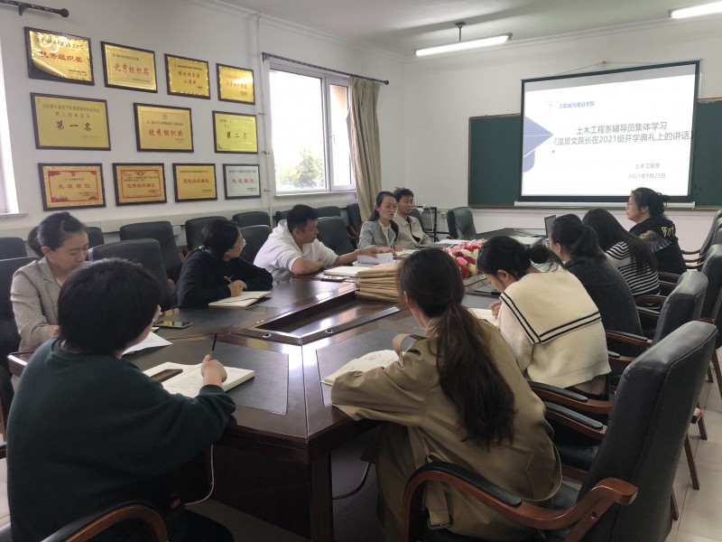 近日,土木工程系组织全体辅导员在出新楼305会议室集中学习《温景文院长在2021级新生开学典礼上的讲话》。学习会由土木系党总支书记、副主任王涵主持。